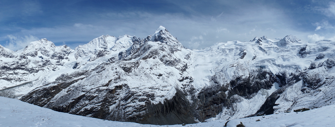 Panorama mit Piz Bernina, Piz Scerscen, Schneekuppe/Muotta da Naiv, Fuorcla da la Sella, Sella und Roseg Gletschern und Coazhütte