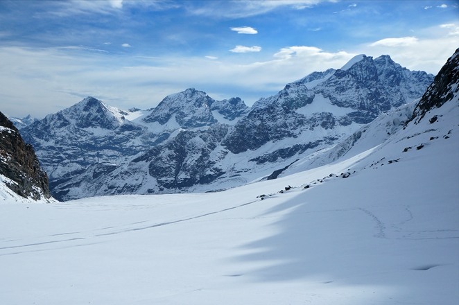 Piz Tschierva, Piz Morteratsch, Piz Bernina, Schneekuppe/Muotta da Naiv, und Piz Roseg von der Fuorcla dal Chapütschin