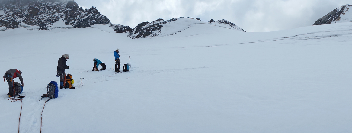 Pause kurz vor der Fuorcla da la Sella (3253 m, rechts im Bild)