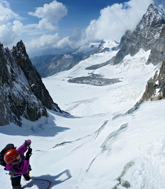 Blick vom steilen Firncouloir hinab auf den oberen Scerscen-Gletscher und Piz Roseg
