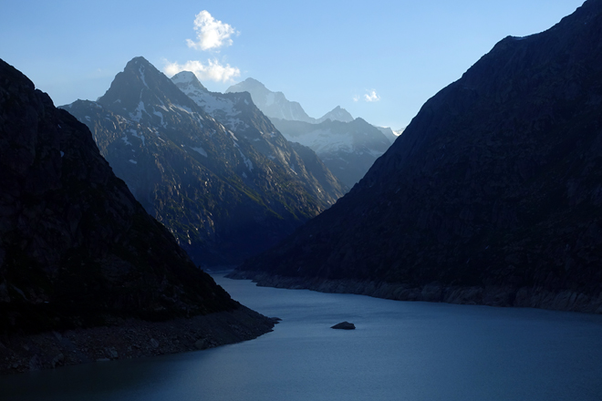 Abendlicht auf Vordre- und Hindre-Zinggenstock, Finsteraarhorn und Agassizhorn ueber dem Grimselsee