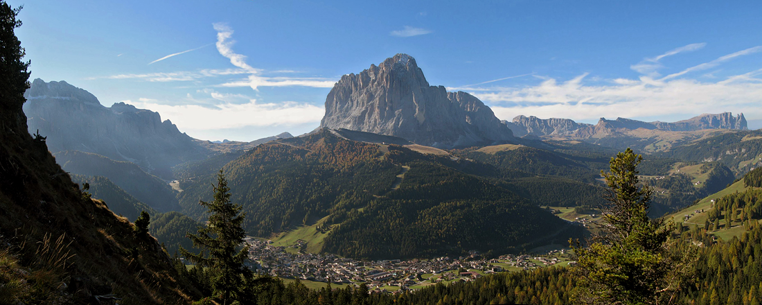 Langkofel Gruppe oberhalb von Wolkenstein (Seiser Alm ganz rechts)