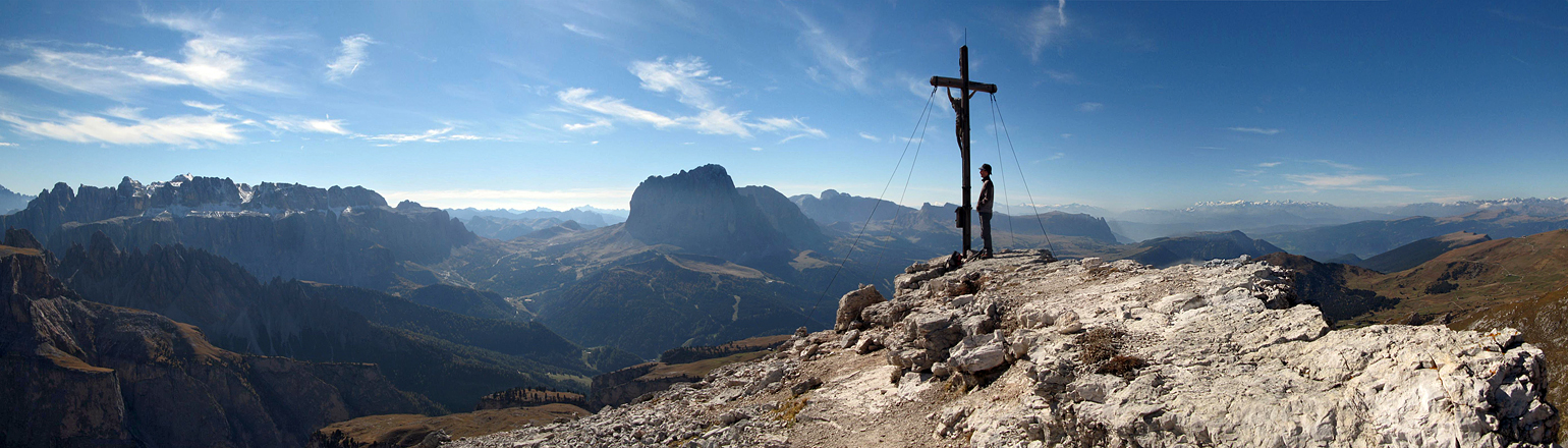 Rundblick vom Col de la Pieres auf Sella Massiv, Langkofel Gruppe, Seiser Alm und schneebedeckte Ortler Gruppe ganz hinten