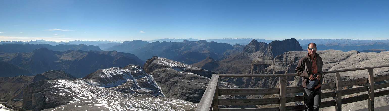 Blick vom Piz Boe au Sass Pordoi, Langkofel, Rosengarten und schneebedeckte Ortler Gruppe
