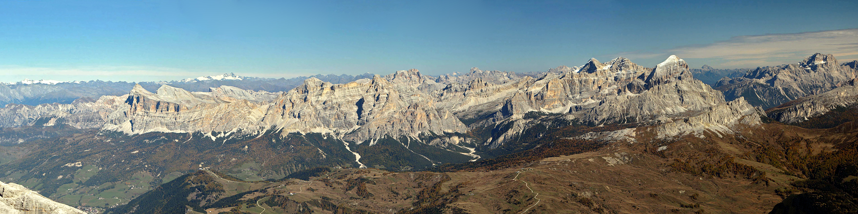 Aussicht auf Fanes-Sennes-Tofanes (schneebedeckte Venediger Gruppe und Grossglockner im Hintergrund)