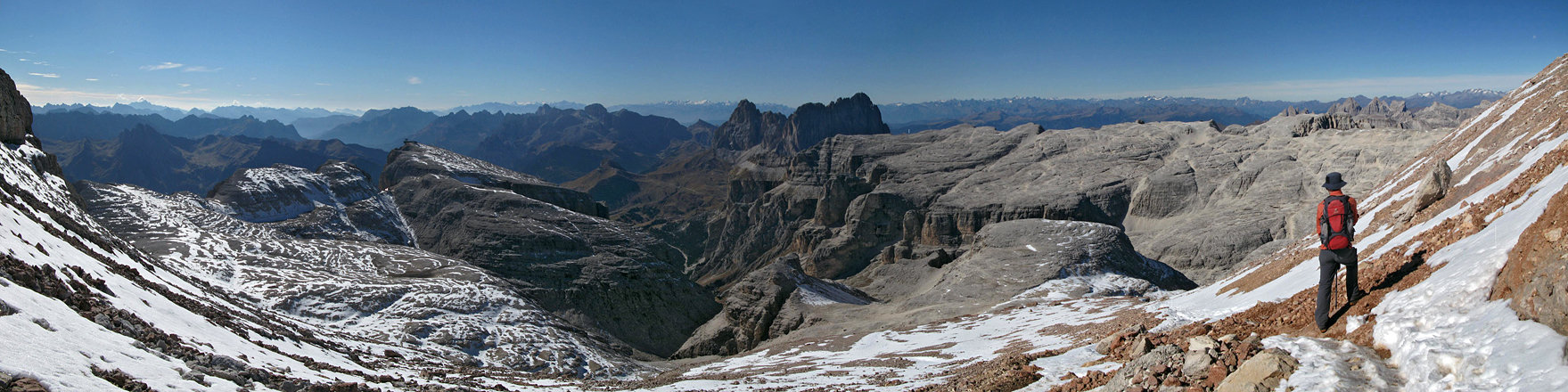 Hochebene des Sella Massivs mit Sass Pordoi, Langkofelgruppe, Rosengarten, schneedeckte Ortler Gruppe u.v.m.