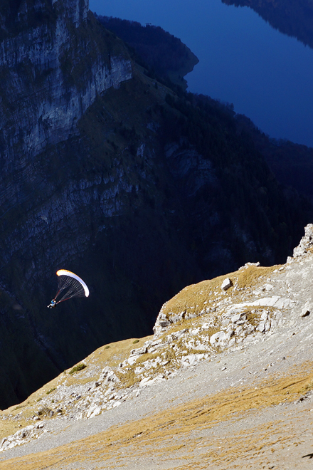 Gleitschirmflieger auf dem Weg ins Klöntal