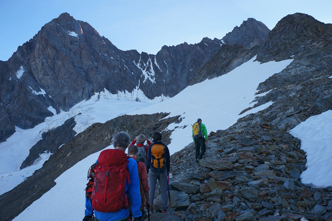 Aufstieg mit Schreckhorn und Lauteraarhorn im Blick